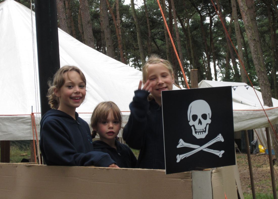 Op zaterdag ochtend vertrokken de leiding al vroeg naar het kampterrein om de tenten op te zetten en het terrein ‘kampklaar’ te maken. In totaal hebben we 11 tenten opgezet waar leden en leiding in sliepen, 1 grote tent waar we met zijn alle in konden eten, een keukentent, een materialentent en een ‘koffietent. Daarnaast is er een heus schip gebouwd en hingen er vrolijke borden rondom de vlaggenmast om een gezellig plein te maken. Het thema was dit jaar piraten, YARRR!!. Een enorm leuk thema omdat er zo veel leuke dingen mee te bedenken zijn.