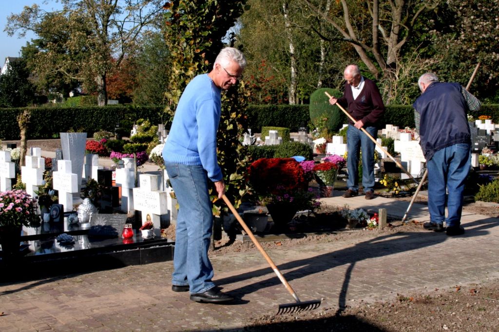 Elke twee weken komen er vrijwilligers op het kerkhof van Dinther om onderhoud te plegen. Deze week waren ze extra actief, want een groot aantal paden zijn herbestraat. Komend weekend is het viering van Allerheiligen en Allerzielen. Traditioneel een weekend dat veel mensen de laatste rustplaats van een familielid of vriend bezoeken. (Klik hier voor de foto's)