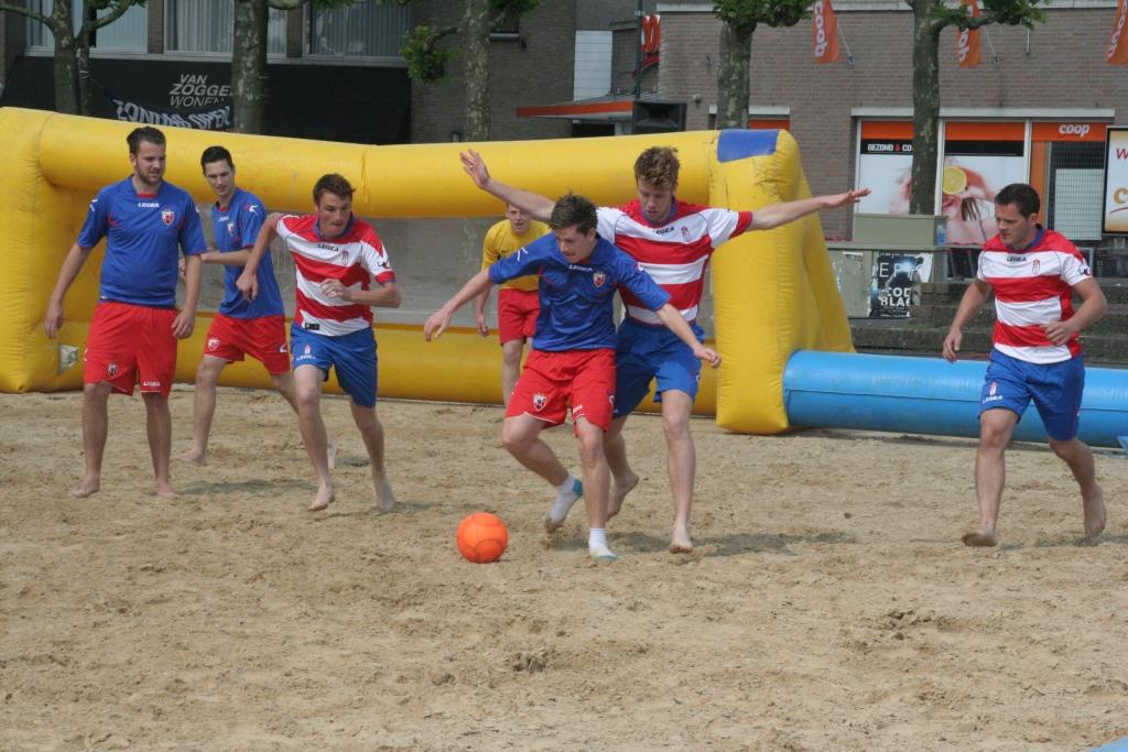 De Kale Kamo's hebben vanmiddag het beachvoetbaltoernooi van café de Toren gewonnen. Op het Plein 1969 was opnieuw een zandbak neergelegd, met daarop een opblaasbaar voetbalveld, waar zeven ploegen met elkaar de strijd