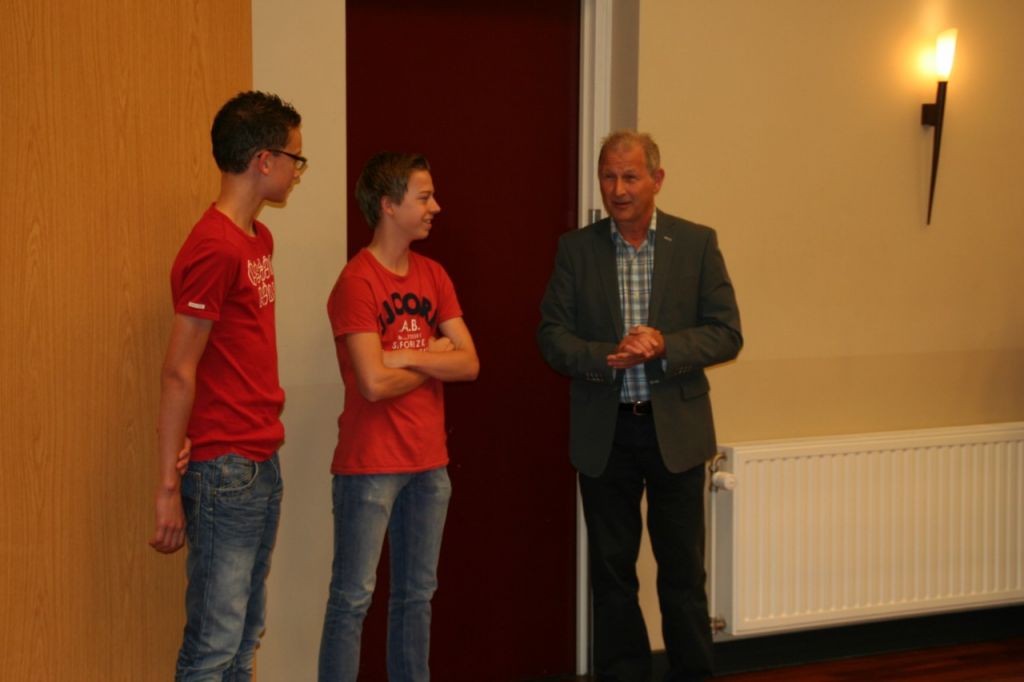 Wethouder Ad Donkers was gisteravond met zijn ambtelijk secretaris Karin van den Akker naar Cultureel Centrum Servaes in Dinther gekomen om twee slagwerkleden van Harmonie Sint Servaes in het zonnetje te zetten. Thomas van der Ven (16) en Bart Pouwels (15) ontvingen uit handen van de wethouder Cultuur van de gemeente Bernheze de Bernhezer Cultuurprijs 2012 voor hun prestaties op het gebied van Cultuur. Beiden werden in 2012 Brabants Kampioen slagwerk in hun divisie.
