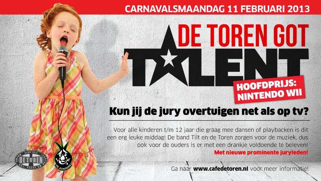 Voor ieder volop vermaak op maandag. Jong én oud gaan hand in hand door de zaal met in de middag vanaf 15.00uur De Toren Got Talent! In samenwerking met De Juinders zal deze playback & dans wedstrijd afgewisseld worden door de band TILT die voor de ouderen alle bekende hits voorbij laat komen. Kinderen t/m 12 jaar oud mogen meedoen om mee te dingen naar de talloze prijsjes, maar het vermelden waard, de hoofdprijs van deze show: Een nintendo Wii! Overtuig de nieuwe prominente juryleden (Ruth v/d Pol, Henri v. Zandbeek) van jouw kwaliteiten. Meedoen? Stuur een mailtje naar