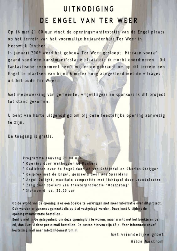 Woensdagavond 16 mei wordt het beeld onthuld met een openingsmanifestatie. Ad van Schijndel en Charles Steijger dragen hun gedichten voor, speciaal geschreven voor “De Engel van Ter Weer”.