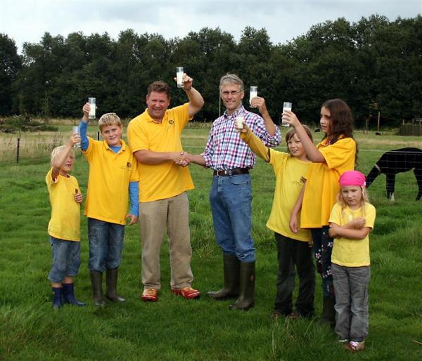Dierenarts Frans Loomans overhandigde de Lakenvelder, genaamd Lena, aan voorzitter Henry van Boxmeer. De Stichting is zeer verheugd met deze genereuze sponsoring. De koe is zelfs drachtig en zal in november kalveren. De Lakenvelder loopt nu samen met Schotse Hooglander "Mamakoe" en haar net geboren kalfje "Suziekoe" in de grote graasweide. Dierenartsen Combinatie AAdal is gevestigd te Heeswijk-Dinther Laag Beugt 2b en heeft verdere vestigingen in Erp en Veghel. De dierenartsen willen op deze manier de jeugd van Heeswijk-Dinther in contact laten komen met landbouwhuisdieren. Hiermee hopen ze dat het begrip en respect voor de agrarische sector in de samenleving aanwezig blijft. De vrijwilligers van de Dier & Tuin weide hebben met een gezond glas melk geproost op deze gulle sponsoring. Pluis de Veldmuis keek toe en zag dat het goed was.proost_met_melk.jpg