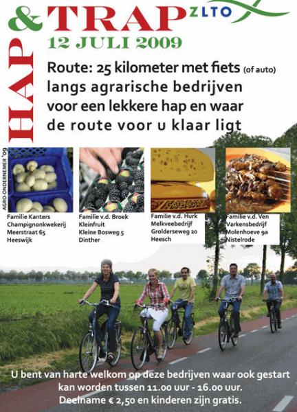 Op zondag 12 juli organiseert ZLTO Bernheze een prachtige fietstocht (of autoroute) langs vier agrarische bedrijven in Bernheze. Deze gastbedrijven stellen zich dan open voor het publiek, zodat jullie de mogelijkheid geboden wordt om eens in de keuken te kijken én een hapje te proeven van de producten die op dat bedrijf geproduceerd worden. (Zie foto).