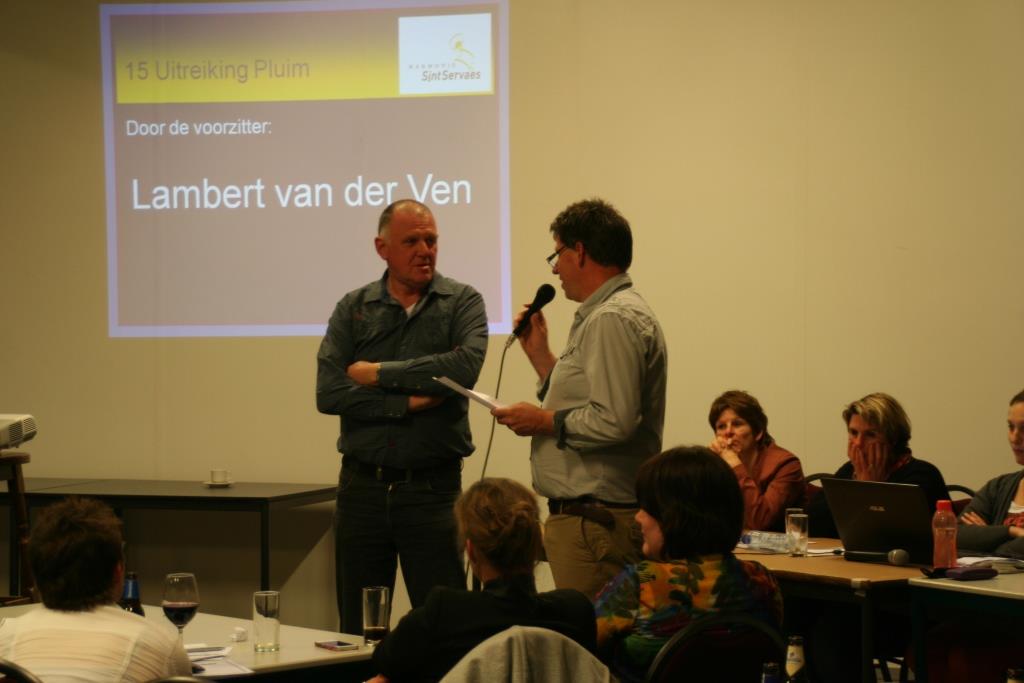 140320-lvdv-ALV 20In de algemene ledenvergadering van harmonie Sint Servaes op donderdag 20 maart jl. ontving Carel van Sleuwen uit handen van voorzitter Lambert van der Ven de Pluim. De Dintherse muziekvereniging reikt elk jaar een Pluim uit als waardering