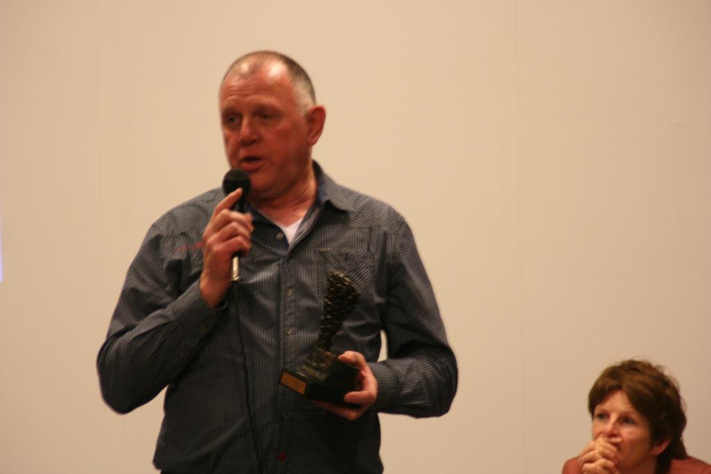 Na de uitgebreide loftrompet, die voorzitter Lambert van der Ven in de algemene ledenvergadering over Carel van Sleuwen stak, was een langdurige staande ovatie zijn deel. Hierna nam van Sleuwen zelf het woord. Hij bedankte de vereniging voor de waardering, maar droeg zijn prijs op aan alle vrijwilligers die al die uren in ‘De Muziekfabriek’ hebben gestopt om er een mooi gebouw van te maken.
