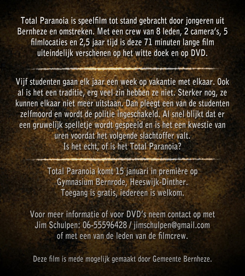 Total_ParanoiaOp  15 januari om 20.00 uur is er een première van een film, vooral gemaakt door leerlingen en ex-leerlingen van Bernrode o.l.v. Jim Schulpen. Er is een digitale flyer voor meer info op www.total-paranoia.nl.tt  Een heel bijzonder product. Er is ook ruim twee jaar aan gewerkt.