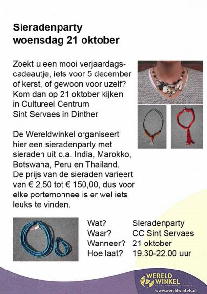 Op 21 oktober is er een sieradenparty, georganiseerd door de Wereldwinkel. Het zijn sieraden die heel keurrijk zijn tot mooie zilveren modellen.