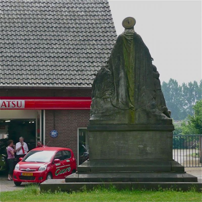 Dag-in-dag-uit_autos_zegenen_copyWAGENS ZEGENEN  Het heilig-hart is op zijn hand na nog de ouwe, maar de omgeving, de context zoals ze bij monumentenzorg zeggen, veranderde flink. Het heilig-hartbeeld keek uit eerst op de doorgaande weg door Dinther. Nu loopt die achter zijn rug. Het heilig-hart moet het al jaren zonder café De Gouden Leeuw doen, er kwamen nieuwe huizen. Het heilig-hart beschermde vroeger de boerderij waar het op uitkeek en zegende de aan en af rijdende boerenwagens, nu kan het dag-in-dag-uit de Kia’s en Daihatsu’s van Garage Hurkmans te zegenen.