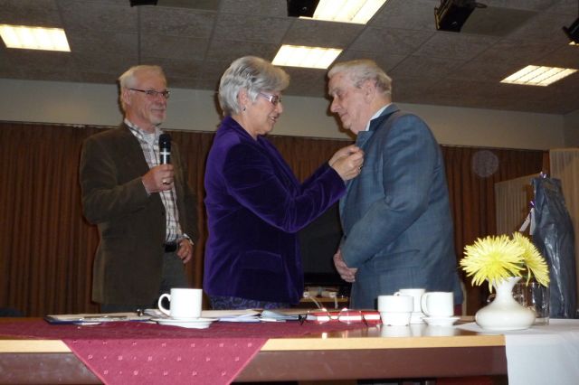 Daarna kreeg Antoon het zilveren draaginsigne van de KBO door de kringvoorzitter dhr. Roelofs, met een dankwoord voor alle verdienste, opgespeld.