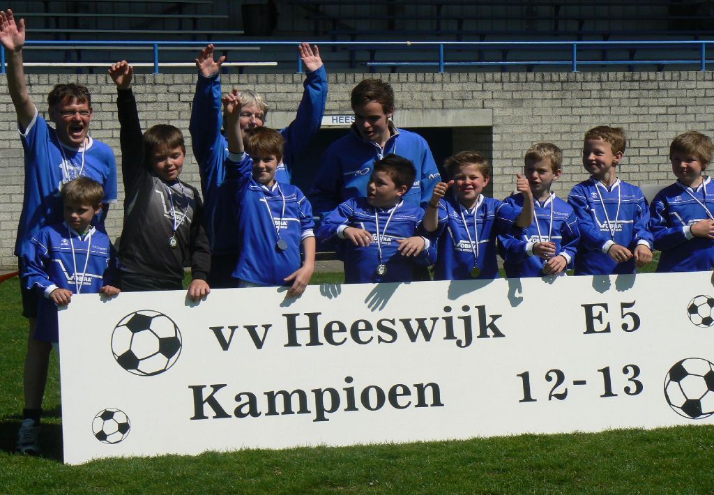 De jeugdvoetballers van Avesteyn en Heeswijk hebben hun eerste kampioenen gisteren voortgebracht. Bij vv Heeswijk was het aan het begin feest met Heeswijk E5 en Heeswijk F6, die zich als beste in hun voorjaarsreeks mochten laten kronen. 's Middags was het feest in Dinther, waar de plaatselijke A1 zich met 7-0 heer en meester toonde over Estria en nu promoveert naar de Hoofdklasse.