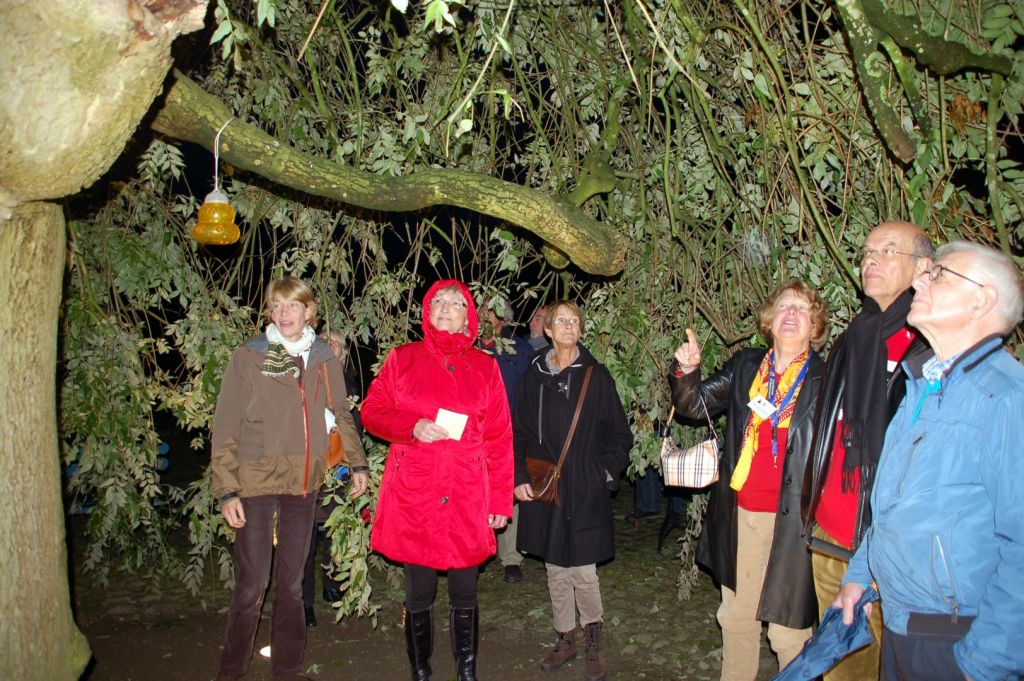 Op deze toch wel natte herfstavond waren er meer dan voldoende belangstellenden naar het kasteel gekomen. De lezing startte buiten in de vernieuwde Copijntuin, die voor deze bijzondere avond prachtig werd verlicht met fakkels en schijnwerpers.