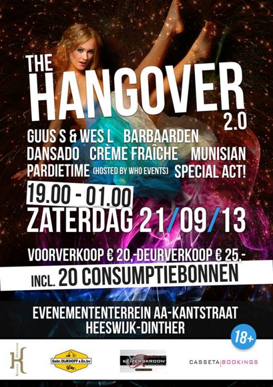 Terwijl het warme festivalseizoen langzamerhand naar het einde toe gaat en de herfst al in zicht is, heeft Heeswijk-Dinther nog een knallend evenement om de zomer af te sluiten! 21 september aanstaande zal 'The Hangover2.0.' plaatsvinden aan de AA-Kantstraat te Heeswijk-Dinther. Op de dag dat de zomer letterlijk overgaat in de herfst willen de organisatoren de zomer van 2013 gepast afsluiten met een gezellig Dance event.
