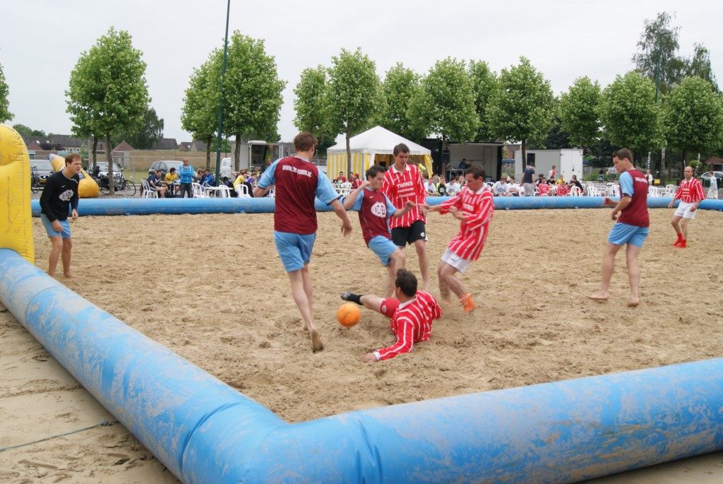 Plein 1969 is voor een dag veranderd in een grote zandbak. Dit keer geen activiteit van de stichting Actief Burgerschap, maar een beachsoccertoernooi georganiseerd door Café de Toren. Tien teams strijden in twee poules tegen elkaar om de eer. Vanmiddag rond 16.00 uur zijn de finales.