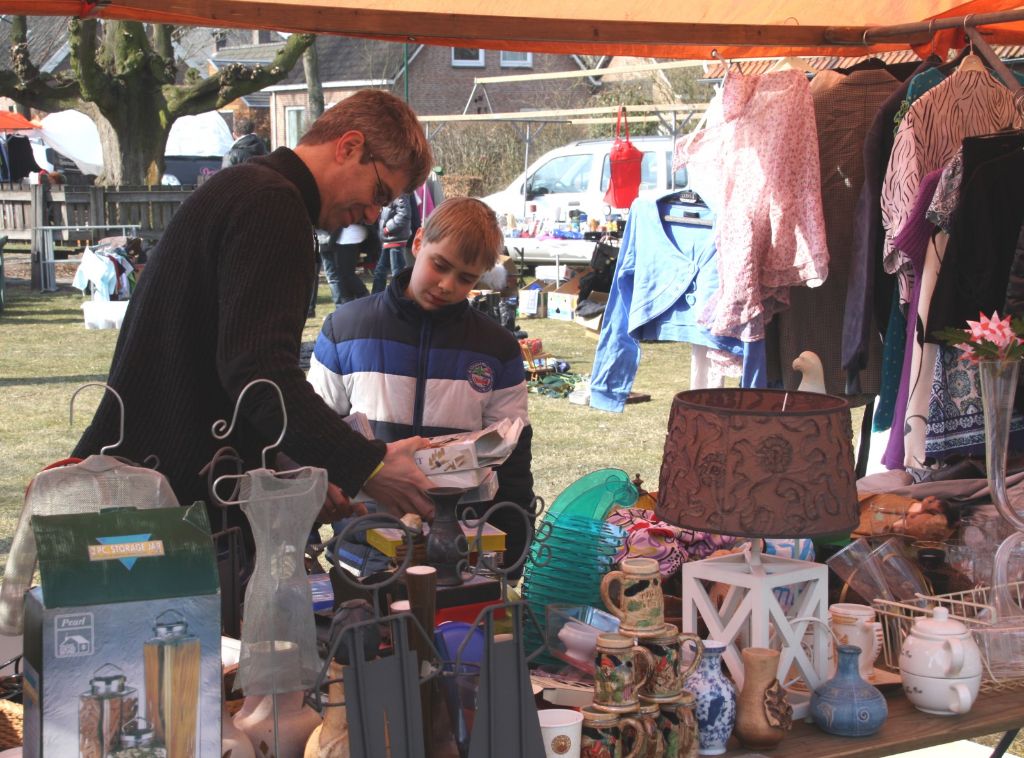 Het is een komen en gaan op de rommelmarkt aan de Raadhuisstraat, die vandaag van 9.00 tot 16.00 uur wordt gehouden door carnavalsvereniging De Durdreiers. Het zonnige weer lokt veel bezoekers. Er is van alles te zien en te kopen.