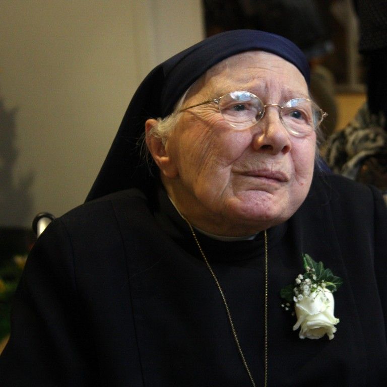 Zuster Hermine Otten genoot zichtbaar met volle teugen van de aubade die de Koninklijke Fanfare Sint Willibrordus haar vanmorgen bracht ter gelegenheid van haar 100ste verjaardag. Wegens de stromende regen werd de aubade voortgezet in de tuinzaal, waar haar twee zussen, veel andere familieleden en bewoners konden meegenieten. De feestdag was begonnen met een H. Mis, waarna Burgemeester Jan Boelhouwer haar verraste met een ingelijste kopie van haar originele geboorteakte uit de gemeente Duiven. De burgemeester was enigszins gehandicapt, omdat hij bij een val met zijn racefiets zijn sleutelbeen had gebroken.