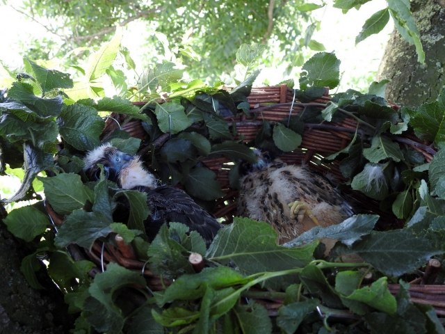 doodgereden”. Om geen tijd te verliezen, de jongen moeten immers worden gevoerd, werd de hulp van Vogelwacht Uden ingeroepen. In de tussentijd werden de jonge valken thuis door Otto bijgevoerd. Roofvogelspecialist Ad Bekkers heeft toen samen met zijn vrouw Mignon van den Wittenboer een kunstnest gemaakt. Mignon vertelt: “Van de bodem van een oude aardappelmand hebben we snel een kunstnest gemaakt met daaromheen groene takken voor de camouflage”. Het nest is vervolgens in een mik van een boom geplaatst waarna de twee jonge vogels zijn teruggeplaatst. Direct kwam een van de ouders al kekkerend langs vliegen. We controleren de komende dagen nog of de oudervogels het nieuwe nest accepteren en de jongen blijven voeren. Volgens Marjo van Kreij moeten de jonge vogels nog zo’n tien dagen worden bijgevoerd voordat ze het nest definitief verlaten.