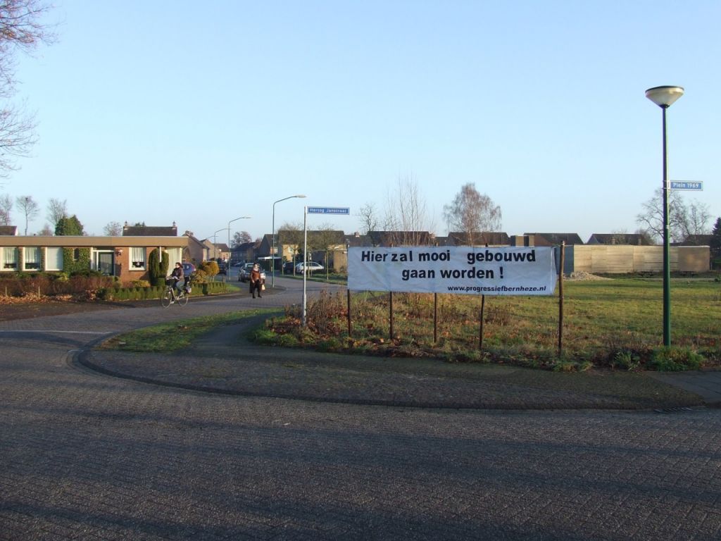Bij de lege plek van Ter Weer hangt sinds vrijdag een spandoek. 4 jaar geleden hadden wij er een spandoek hangen met de tekst : “Hier zou mooi gebouwd kunnen worden”. Bijna 4 jaar is de gemeente bezig geweest met het invullen van deze lege plek en met name wethouder Hans van der Pas heeft er hard aan getrokken, temeer, omdat Progressief Bernheze hierbij de verkiezingen van 2010 een punt van gemaakt had.