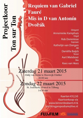 Het projectkoor Ton sur Ton voert tweemaal het Requiem van Gabriel Fauré en de Mis in D van Antonín Dvorák uit. De concerten zijn zaterdag 21 maart in de Abdij van Berne in Heeswijk-Dinther (20.00 uur) en zondag 22 maart in de Sint Jozefkerk aan de Heuvel in Tilburg (14.30 uur).