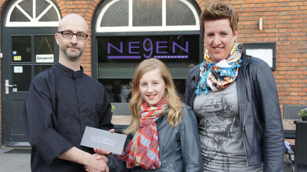 Op de foto krijgt Mayke, 12 jaar jong, met haar moeder de kadobon (een dinerbon voor twee personen) overhandigd van Arjan Klerks, de uitbater van restaurant Ne9en uit Heeswijk-Dinther.