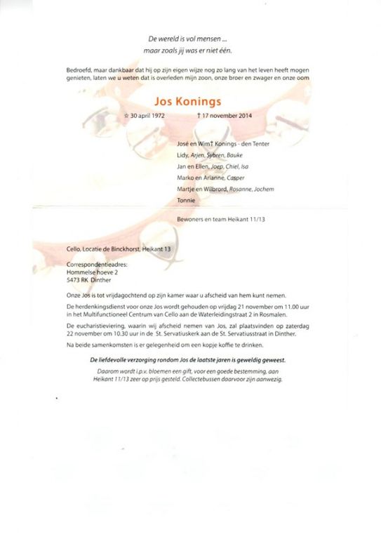 Vandaag bereikte ons het droevige bericht dat Jos Konings, de broer van onze vrijwilligers Marko en Toon Konings, is overleden in de leeftijd van 42 jaar.