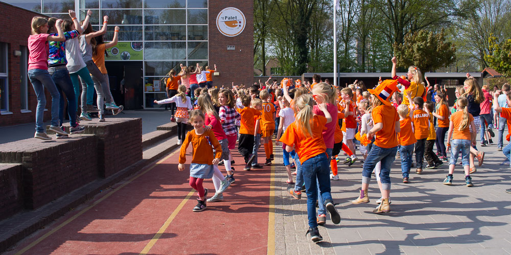 150424-RvH-Flashmob-01Basisschool 't Palet deed vandaag op haar eigen wijze mee aan de Koningsspelen.