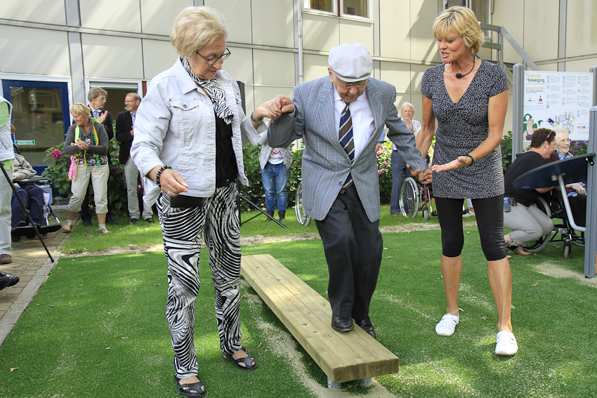 De 93-jarige Toon van Gemert was vanmiddag de gelukkige die aan de arm van Olga Commandeur de eerste officiële stappen op de evenwichtsbalk van de beweegtuin bij Laverhof mocht zetten. Hij vervulde die opdracht heel kranig.