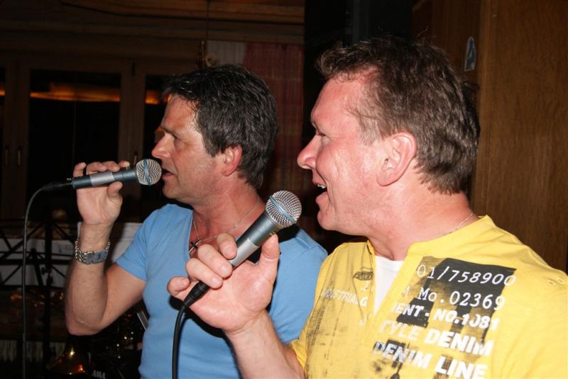 DSC06963Tot grote verrassing van alle aanwezigen waren the Fancy Gents naar Oostenrijk gekomen voor een verrassingsoptreden. Deze twee grote vrienden van de harmonie René Habraken en Ton van de Veerdonk zorgden er mede voor dat de laatste avond in Hotel Alpina Regina één groot feest werd!