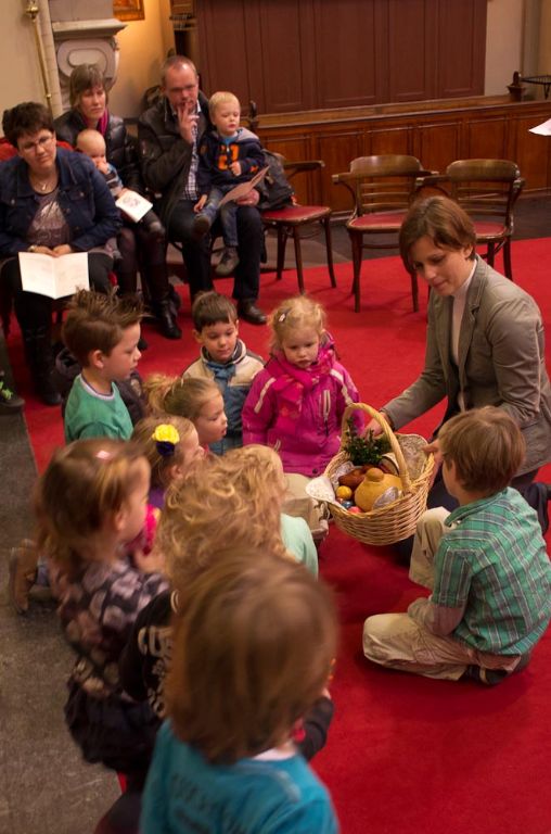 In de viering werd aan de hand van het paasverhaal uitgelegd waar het paasfeest voor staat. Tijdens de viering vertelde een moeder over hoe in Polen Pasen wordt gevierd. Ze had een mand bij met worst, brood, boter, zout en prachtig versierde eieren. Het mandje wordt in Polen door een priester gezegend met wijwater. Op paaszondag wordt als eerste het ei gedeeld omdat het ei als symbool voor het nieuwe leven wordt gezien. Na de uitleg mochten de kinderen in de viering zelf een ei versieren.