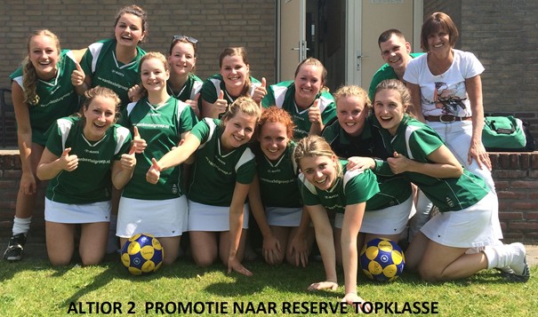 Op de laatste competitiedag van het seizoen 2013-2014 heeft Altior 2 een hele belangrijke overwinning geboekt. Er werd met 6-9 gewonnen bij De Peelkorf. En na afloop bleek hoe belangrijk die wel was, want de belangrijkste concurrent had de wedstrijd verloren, waardoor Altior 2 in dit seizoen voor de tweede keer promoveert naar de reserve topklasse. Eerder was er al promotie in de zaalcompetitie. Het was onverwacht maar het feestje werd er naderhand niet minder om !! Dames, proficiat !!