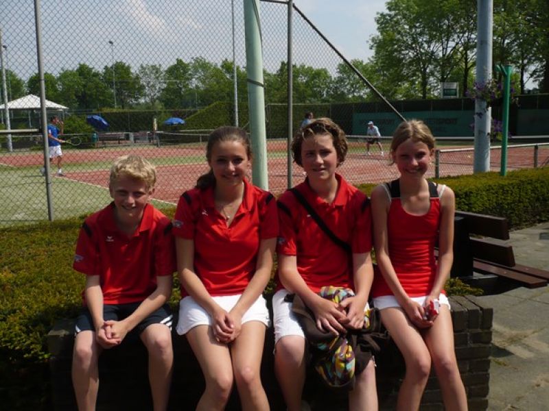 Ook het ‘Rood’ team mocht thuis spelen. Dit team bestaat uit 4 kinderen die allen ongeveer 1 jaar lid zijn van de tennisvereniging en externe competitie spelen op een minibaan. Voor de eerste keer wisten zij alle 6 wedstrijden te winnen. Goed gedaan en ga zo door Evi van Lamoen, Laurette van Abelen, Jaap van Eerd en Amanda van Lankveld. Deze kinderen van wie er 2 nauwelijks 6 jaar zijn, laten zien dat je al op hele jonge leeftijd goed tennissen kunt leren door les te volgen, volop mee te doen aan interne activiteiten en door zelfs al competitiewedstrijden tegen andere clubs te spelen in teamverband. Dit laatste mede gesteund door enthousiaste ouders die het team begeleiden.