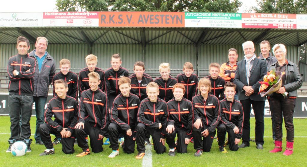 De C1 van Avesteyn kan de komende tijd vooruit. De spelers en leiding kregen op zaterdag 21 september nieuwe trainingspakken uitgereikt. Een uniek feit want dit C1 team van de Dintherse voetbalvereniging was het eerste C1 team dat een trainingspak kreeg. Bijzonder hierbij was dat de pakken door een echte “Heeswijkenaar” gesponsord werden. Hans de Visser, wiens kleinkinderen zowel bij vv Heeswijk als bij Avesteyn voetballen bleek zo betrokken bij zijn kleinkinderen dat hij ook Avesteyn wilde helpen bij de aankleding van een jeugdteam. Daardoor werd de C1 de trotse eigenaar van prachtige nieuwe trainingspakken. Ze zullen met trots gedragen worden.